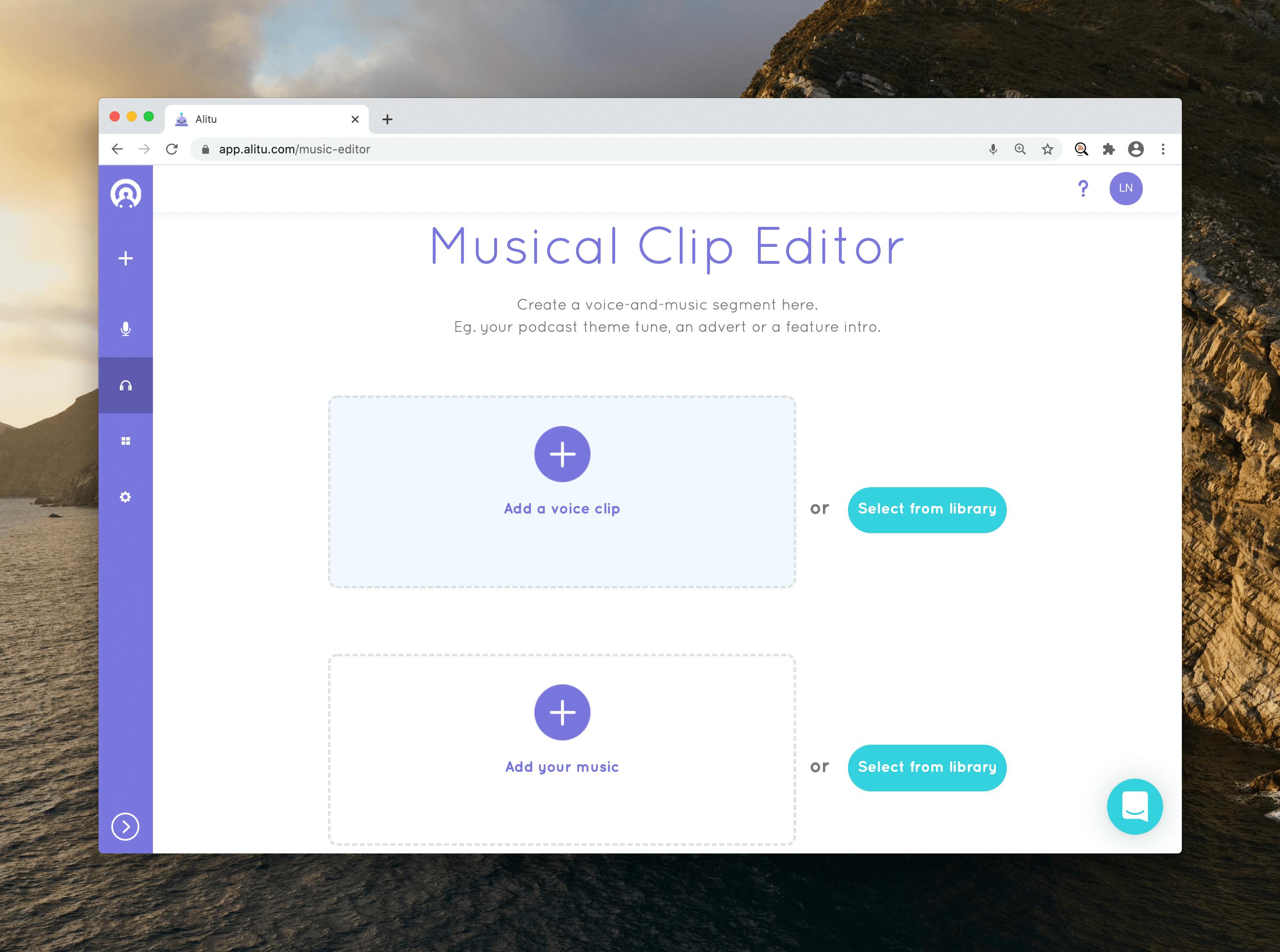 From here, you can access the tool's Musical Clip Editor, where you can record intros and voiceovers using royalty-free music from the Alitu Music Library.