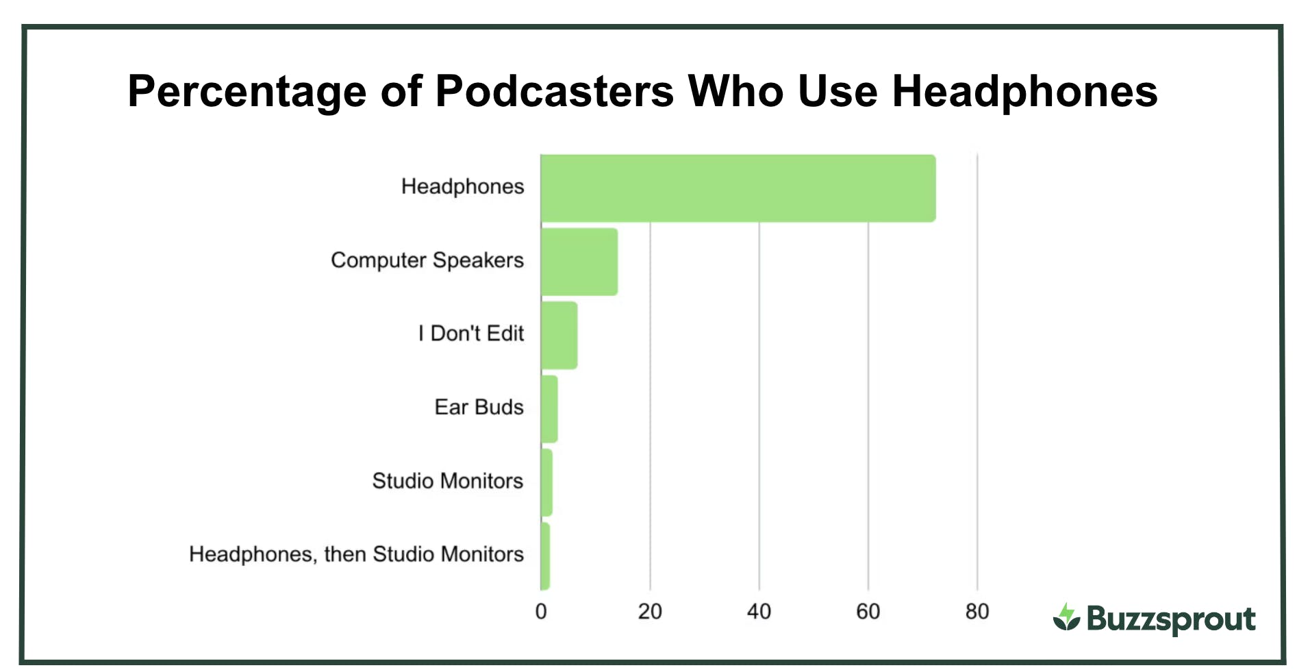 Over 72% of podcasters use headphones when they record to monitor sound and keep static, volume, and other levels within range. A good pair of headphones is a critical part of capturing consistently high-quality audio.