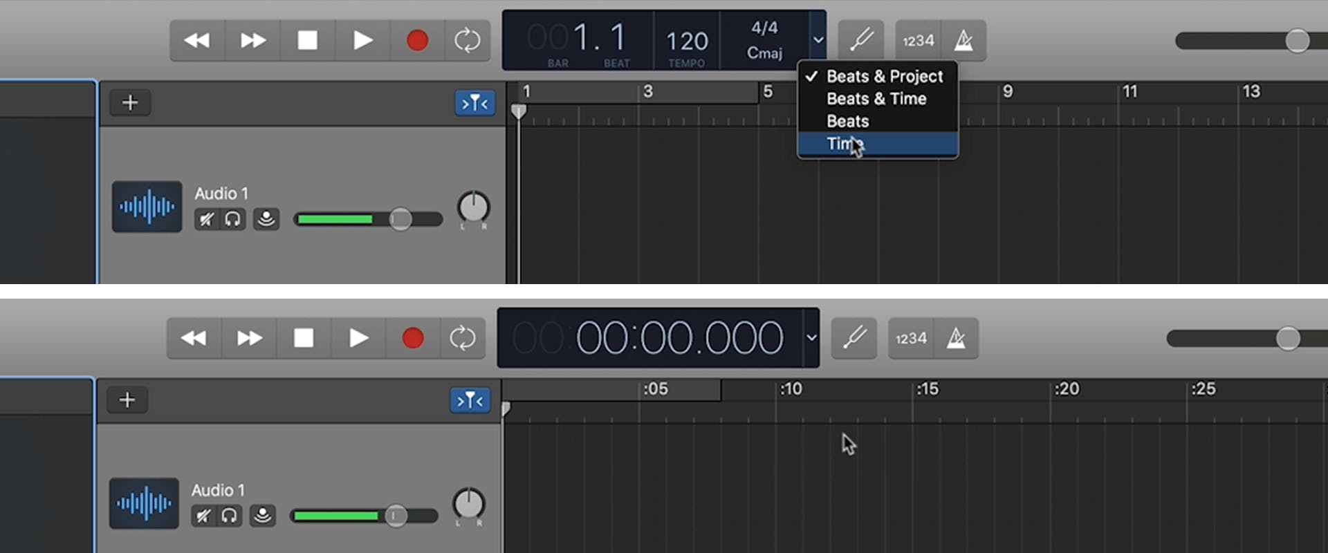 Choose Time from the transport dropdown menu to simplify the display. Then, click on the metronome and count-in features to the right of the display to turn them off. Go to File > Save As to save your recording.