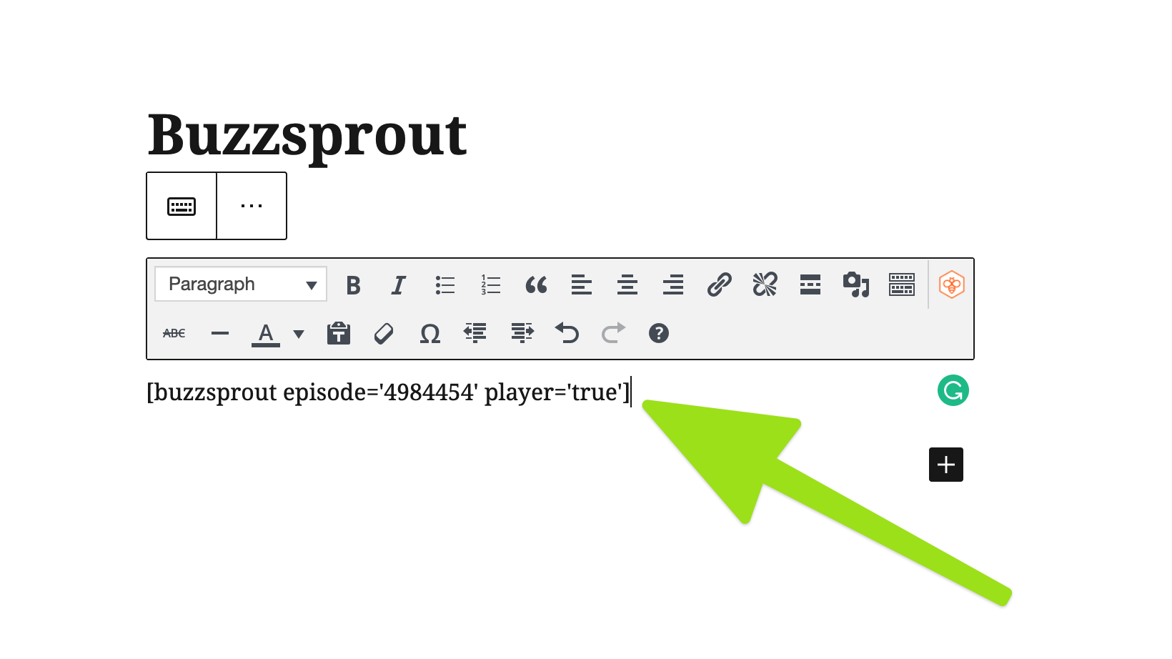 Now the plugin is ready to use! So, when you want to add one of your Buzzsprout episodes to a post, you can do that directly from the editor! The process of dropping in episodes using the plugin is very easy!