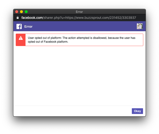 When sharing a post to Facebook you may sometimes get an error: User opted out of platform: The action attempted is disallowed, because the user has opted out of Facebook platform.