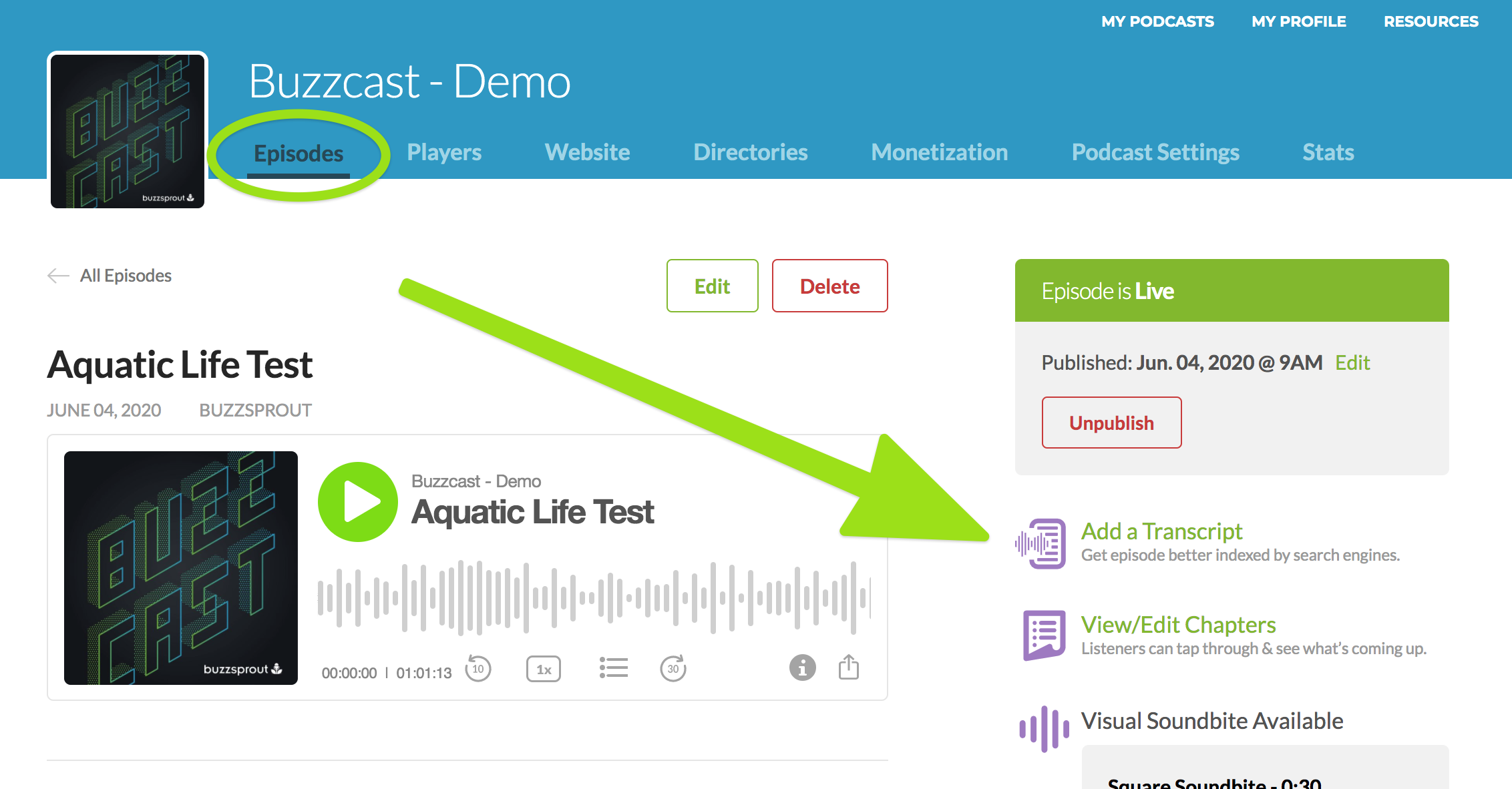 Take the file exported from Otter.ai and upload it to Buzzsprout. Start by clicking into your episode and then find the "Add a Transcript" button on the right sidebar.