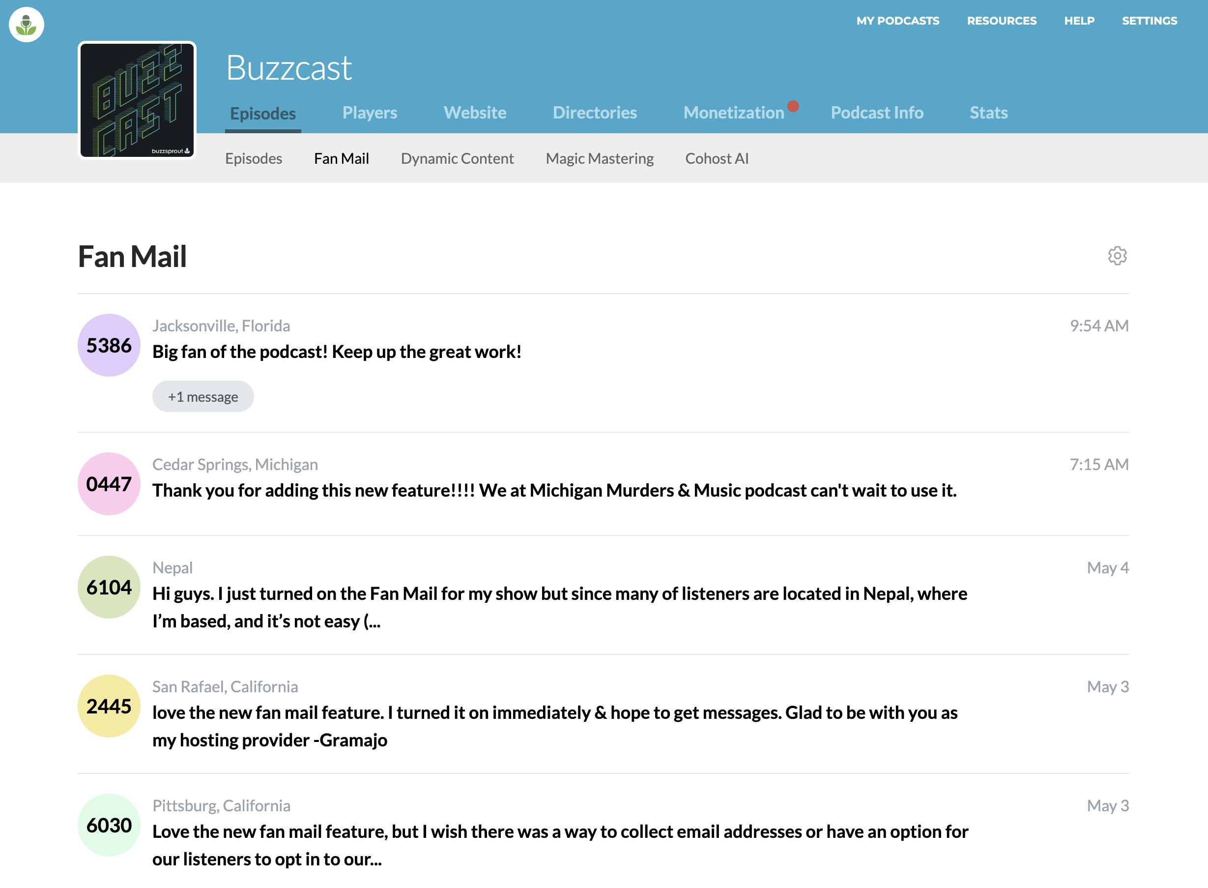 Fan Mail lets your listeners text your podcast, and their messages appear inside your Buzzsprout account.